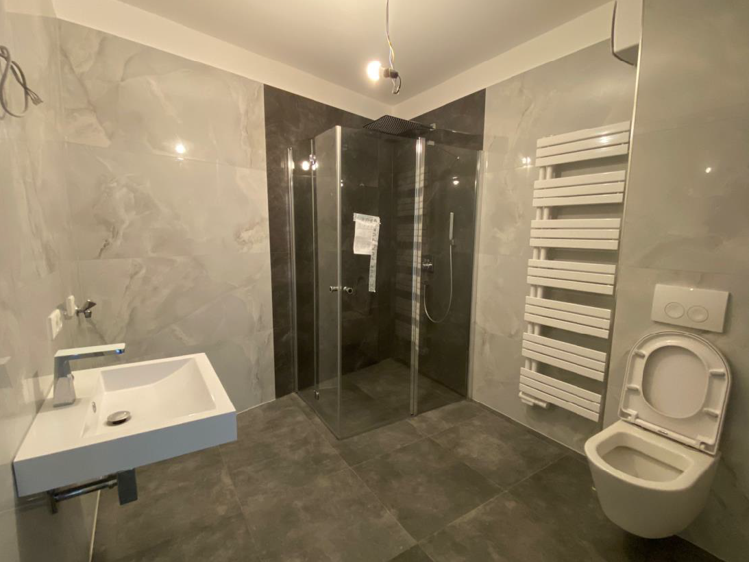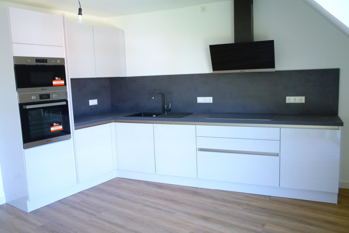 Die optisch ansprechende grifflose Einbauküche ist weiß/anthrazit gehalten und alle technischen Geräte sind vorhanden. Das stilvolle Duschbad ist hochwertig ausgestattet und rundet das Angebot ab.