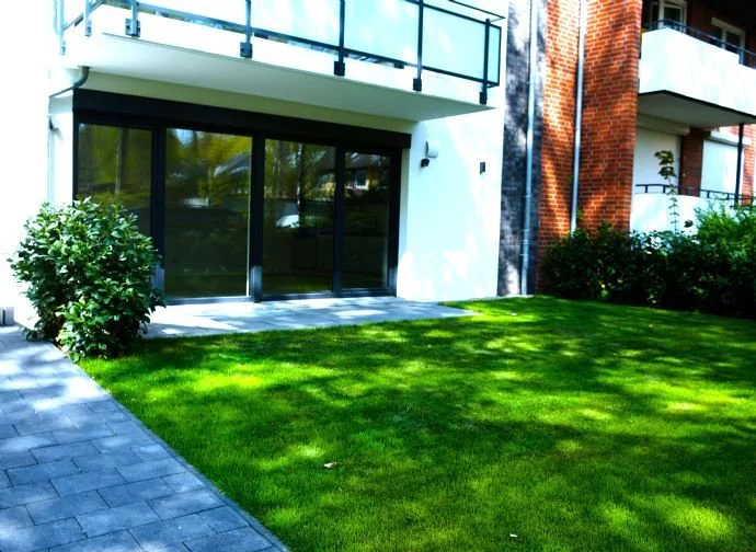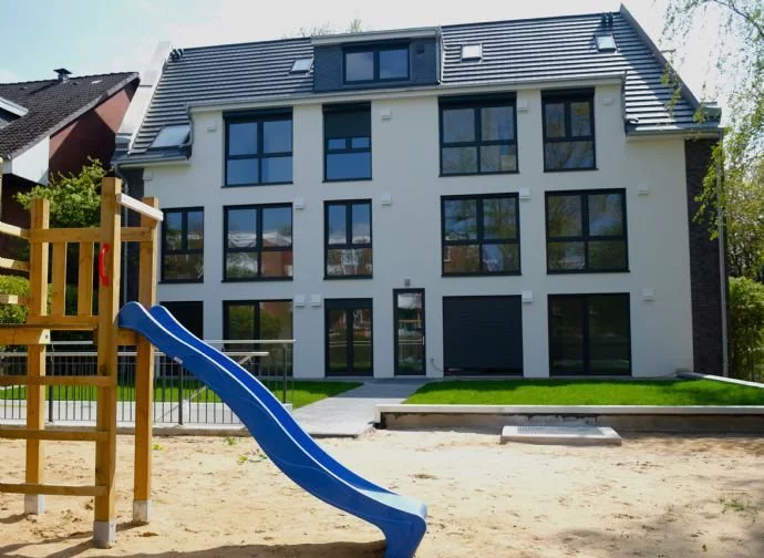 Objektbeschreibung Das im Sommer 2022 fertiggestellte Mehrfamilienhaus verfügt über sechs Eigentumswohnungen und ist durchweg hochwertig und modern ausgestattet. Das Objekt ist barrierefrei und ein Aufzug verbindet alle Etagen bis zur Tiefgarage. Die moderne Tiefgarage mit Vorbereitung zur Installation von Ladestationen für E-Autos bietet insgesamt sieben Stellplätze. Versorgt wird das Haus über eine Gasheizung und die Warmwasseraufbereitung erfolgt über eine Solaranlage. Das Haus entspricht dem KFW55 Standard. Alle Wohnungen sind mit elektrischen Außenrolläden versehen. Raumaufteilung Die Wohnung besteht aus 4 Zimmern. Die große und sonnige Wohnküche mit einer optisch ansprechenden grifflosen Einbauküche befindet sich auf der Südseite vom Haus. Die Küche ist weiß/grau gehalten und alle technischen Geräte sind vorhanden. Das Schlafzimmer mit großen Fenstern befinden sich im hinteren Bereich und schaut in den Garten. Zwei weitere Zimmer mit Gartenaussicht und großen Fenstern können als Kinderzimmer bzw. Arbeits- oder Hobbyzimmer genutzt werden.Die zwei Terrassen sind auf der Nord und Südseite verteilt. Das stilvolle Duschbad ist hochwertig ausgestattet, das Gäste-WC rundet das Angebot ab